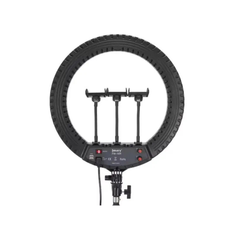 مصباح حلقي جماري FM-18R مقاس 18 بوصة (43 سم). مثالي لإنشاء محتوى فيديو واضح واحترافي، والبث المباشر، والتصوير، ومكالمات Zoom. يضمن إضاءة موحدة وخالية من الوهج.