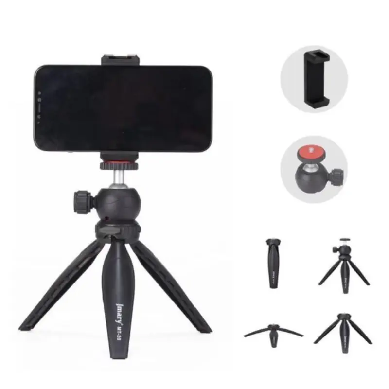 على الرغم من صغر حجمه، يوفر حامل ثلاثي القوائم الصغير Jmary MT-20 ثباتًا ممتازًا. يتحمل حمولة تصل إلى 1.5 كجم، مما يجعله متوافقًا مع كاميرات DSLR والهواتف الذكية وكاميرات الحركة وغيرها من الأجهزة المزودة بحامل لولبي عالمي مقاس 1/4 بوصة. يتميز الحامل الثلاثي بأقدام مانعة للانزلاق وحامل قابل للفصل، مما يضمن ثبات الصور حتى على الأسطح غير المستوية.