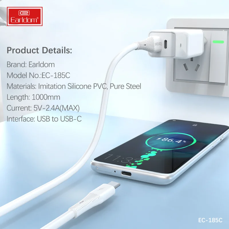 The Earldom EC-185C USB to USB-C Fast Charging Cable is designed to deliver fast and efficient charging for all your USB-C devices. With a 2.4A maximum current output, it ensures your smartphone, tablet, or other devices charge quickly without overheating. This makes it ideal for people who need a reliable cable that saves time and energy. Moreover, its 5V voltage output guarantees stable power delivery, protecting your devices from sudden surges or damage. Whether at home, in the office, or on the go, this usb-a to usb-c ensures consistent performance and safety every time you plug it in.