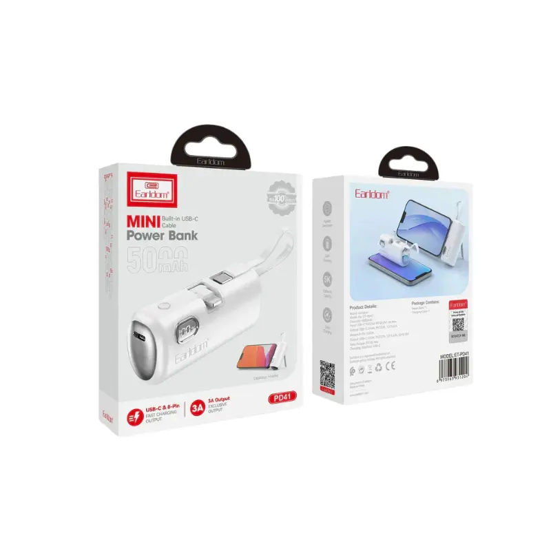 Designed for convenience, the Earldom PD41 makes charging effortless wherever you are. Its dual ports — Type-C and Lightning — ensure wide compatibility, while the compact design eliminates the need for carrying multiple chargers. Though its capacity is 5000mAh, it delivers performance that rivals even larger models like a power bank 50000mah, offering consistent and powerful output every time. This POWER BANK is perfect for daily use, business trips, and outdoor adventures. Experience the freedom of staying connected with the Earldom POWER BANK, the ideal solution for those who demand performance, safety, and portability in one stylish package.