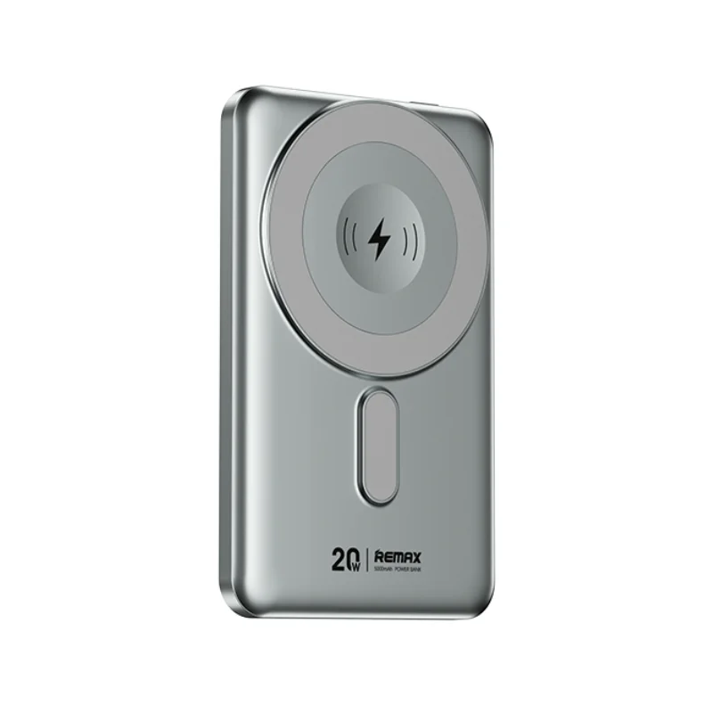 Remax CX-1 Power Bank 5000mAh – sleek silver design with wireless charging and built-in cables.